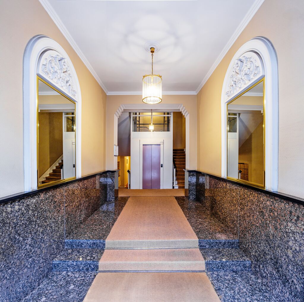 Der Eingangsbereich der Fechnerstraße 5 ist ein Highlight des Hauses – und ein Vorgeschmack auf stilvolles Interieur. Jugendstil-Lampen komplettieren mit dezentem Stuck und rot-schwarzen Granitfliesen die prachtvolle Aura des Eingangsbereichs.