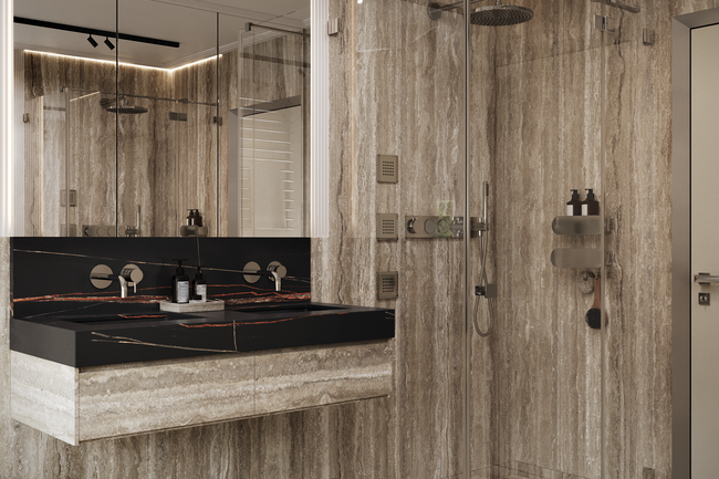 Edle Badezimmerverfliesung und wandbündige Türen für einen eleganten Look