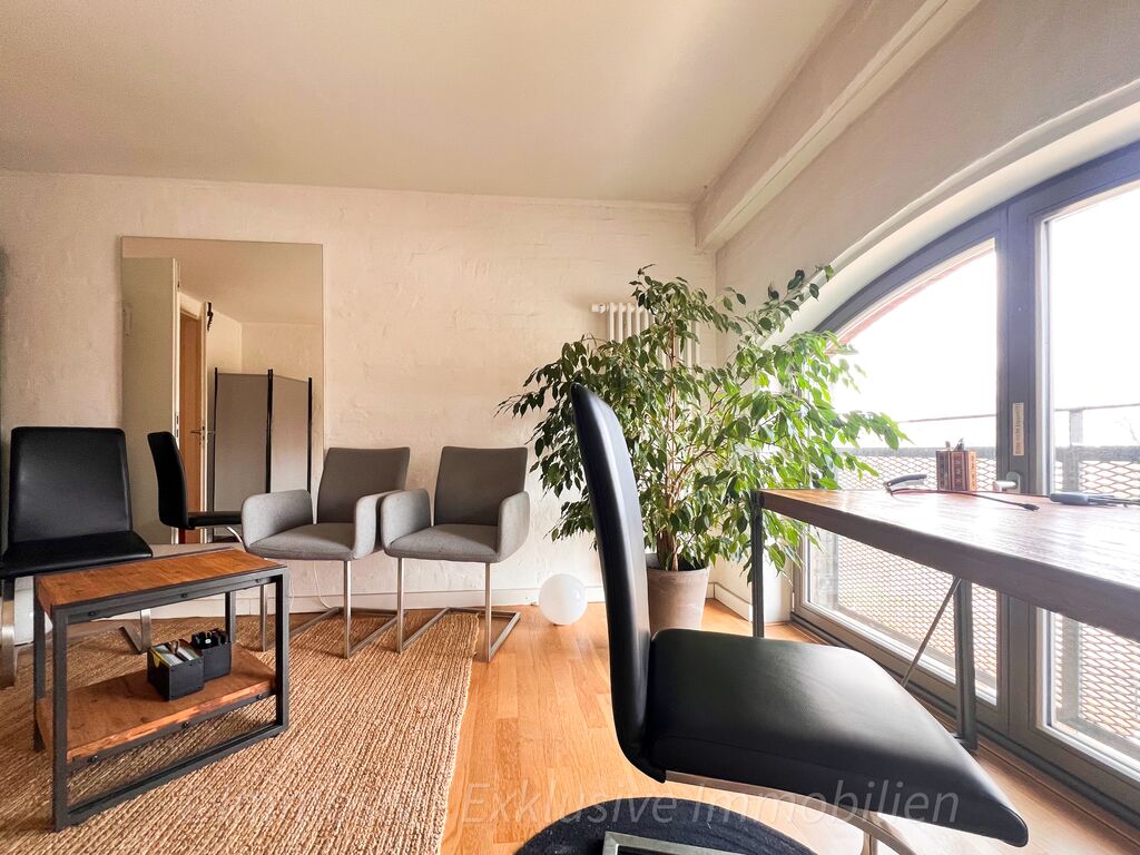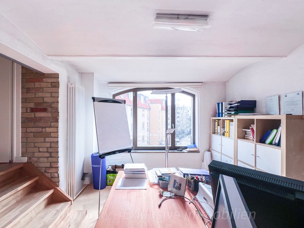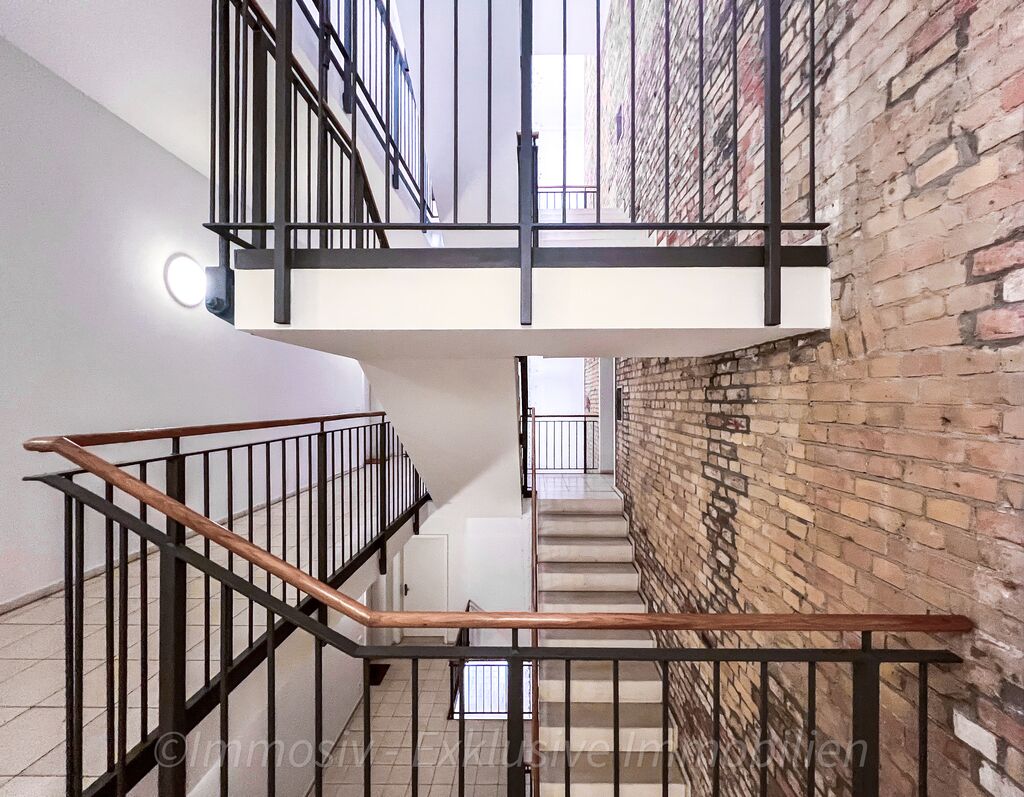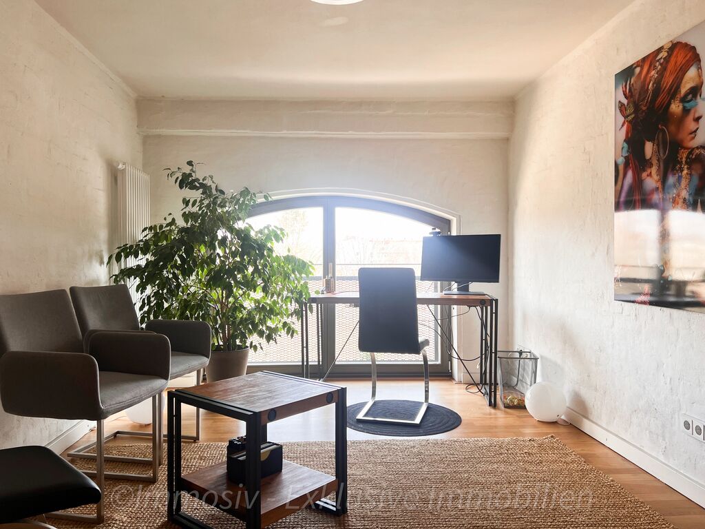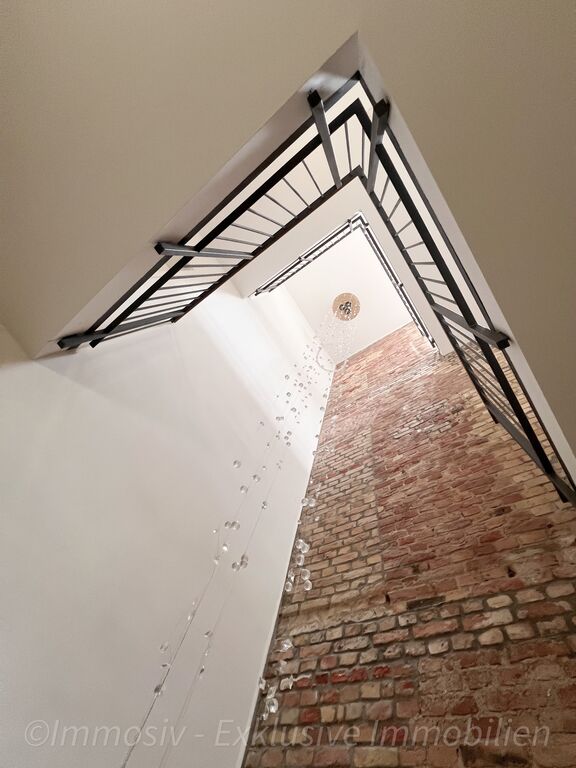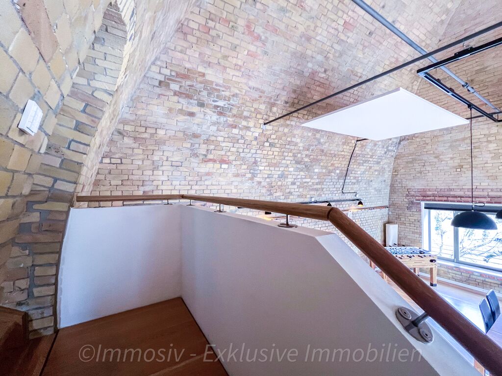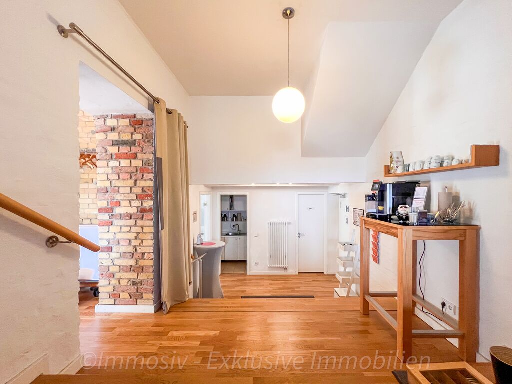Über eine interne Treppe gelangt man in das Obergeschoss der Wohnung, das sich harmonisch in die Architektur einfügt. Hier befinden sich ein weiterer Raum mit Oberlicht – ideal als ruhiges Homeoffice oder Atelier –, das Masterbad, ein praktischer Abstellraum sowie ein zweiter Zugang über das Treppenhaus als Fluchtweg.
