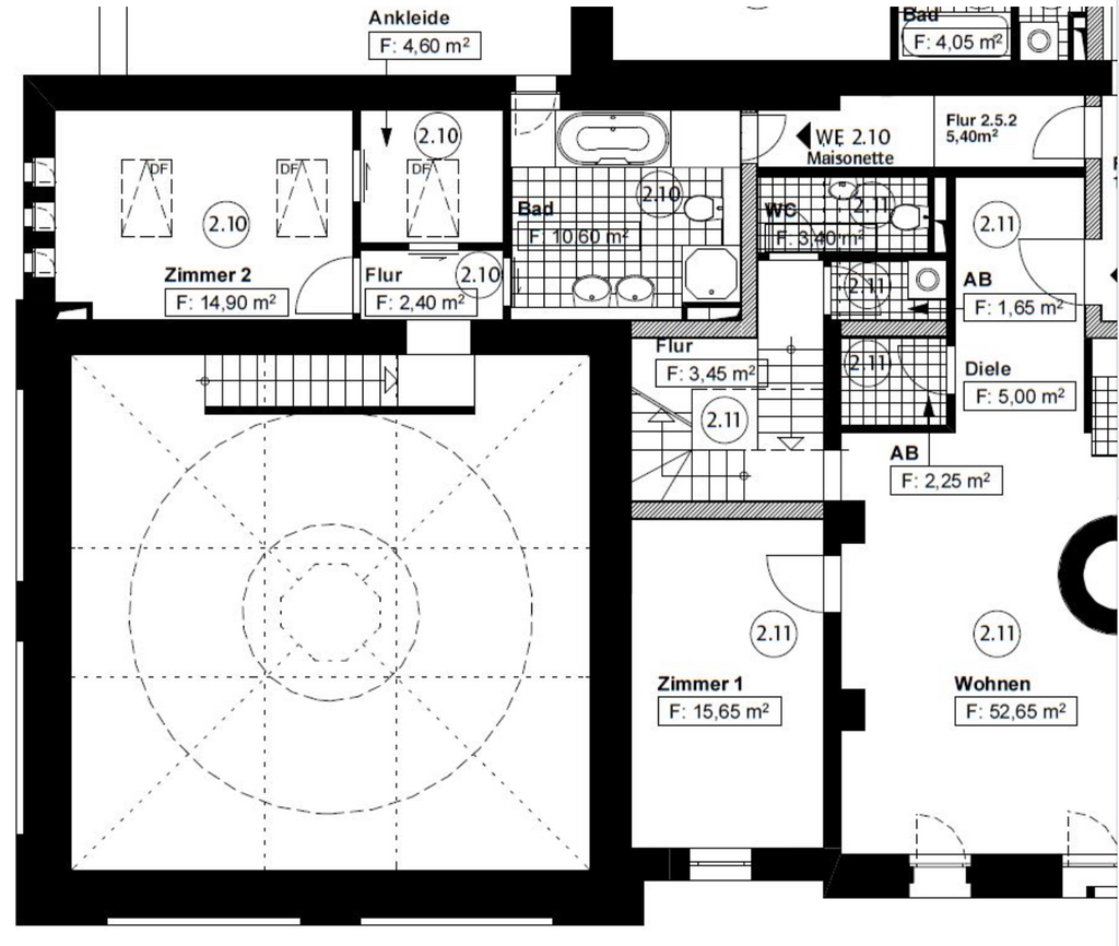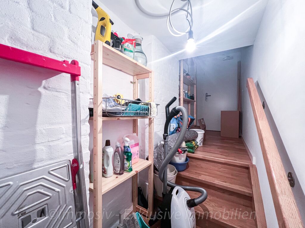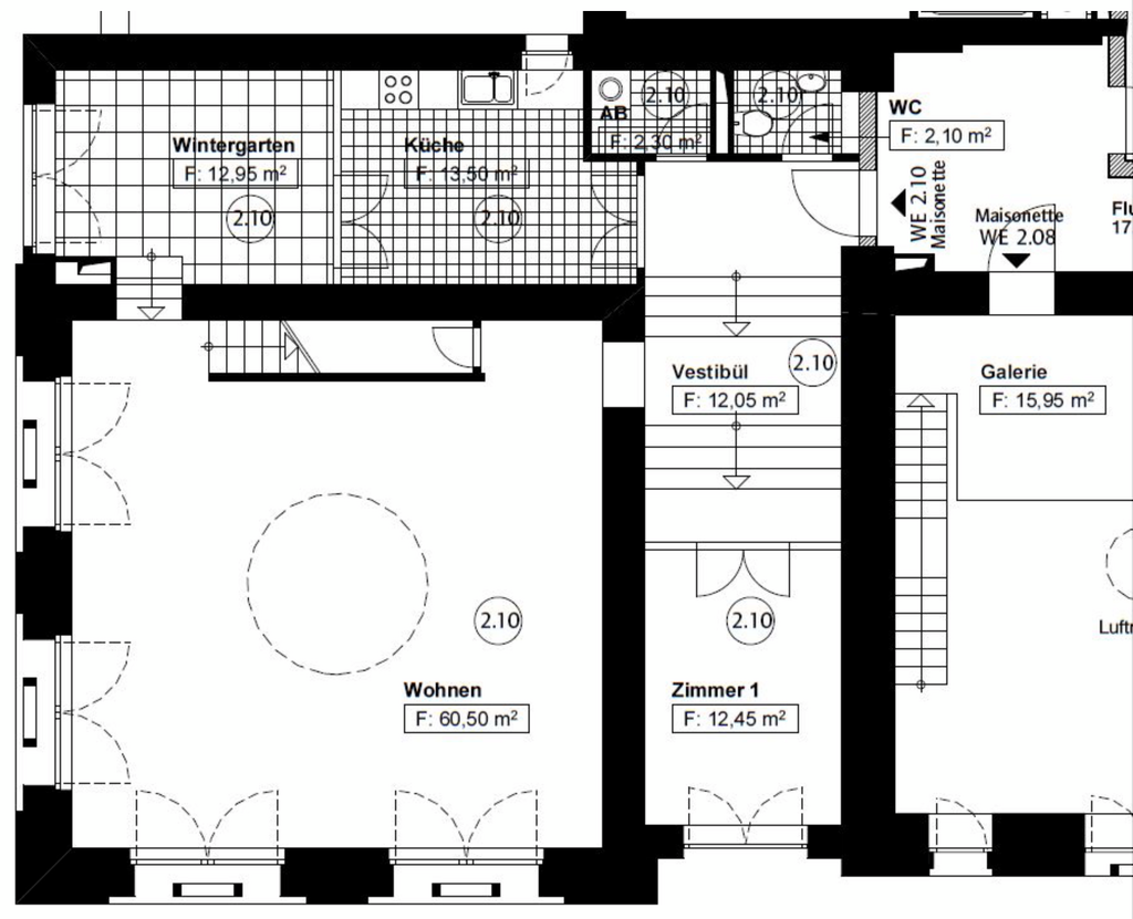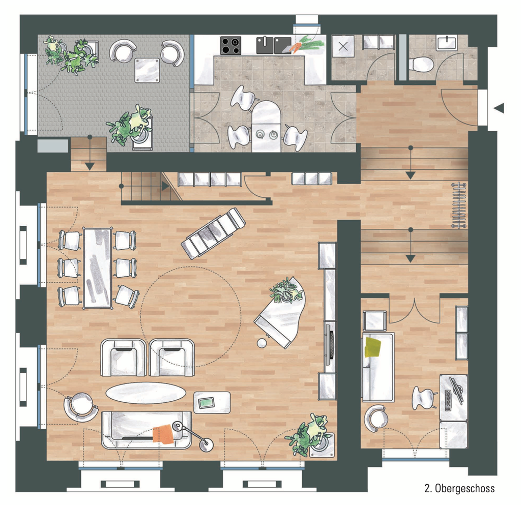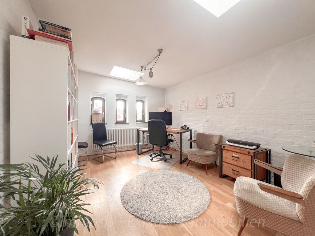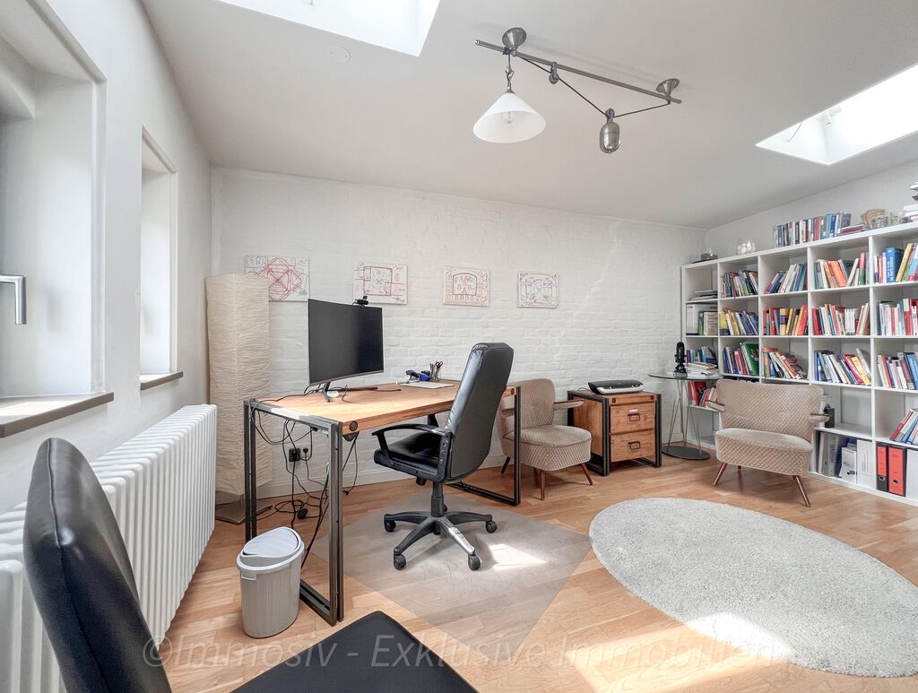 Über eine interne Treppe gelangt man in das Obergeschoss der Wohnung, das sich harmonisch in die Architektur einfügt. Hier befinden sich ein weiterer Raum mit Oberlicht – ideal als ruhiges Homeoffice oder Atelier –, das Masterbad, ein praktischer Abstellraum sowie ein zweiter Zugang über das Treppenhaus als Fluchtweg.