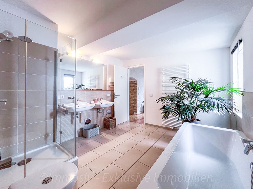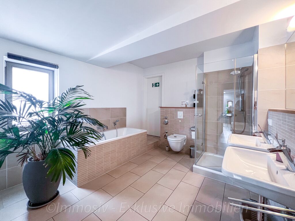 Das Tageslichtbad im Dachgeschoss ist ein weiteres Highlight: ausgestattet mit einer Dusche, Badewanne, Doppelwaschbecken und stilvollen Fliesen – ein Ort zum Entspannen und Wohlfühlen.