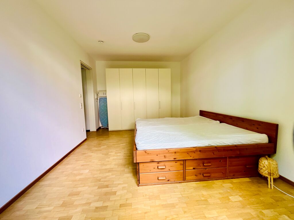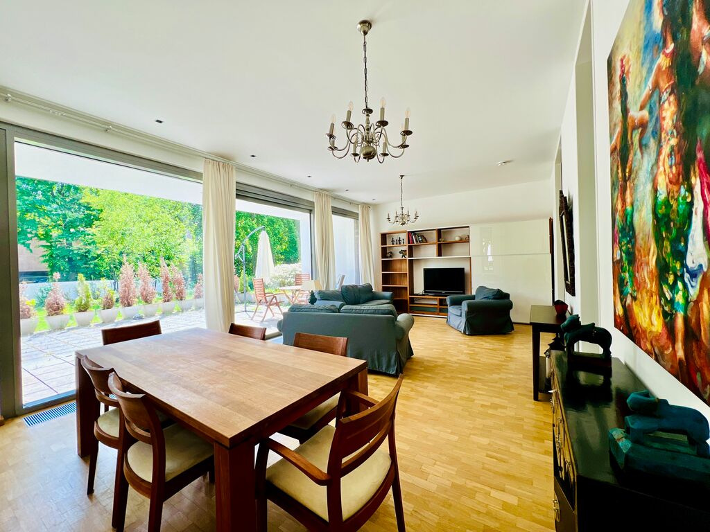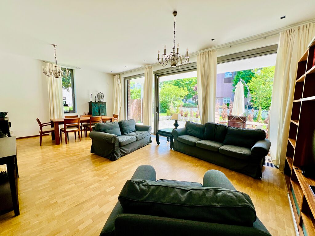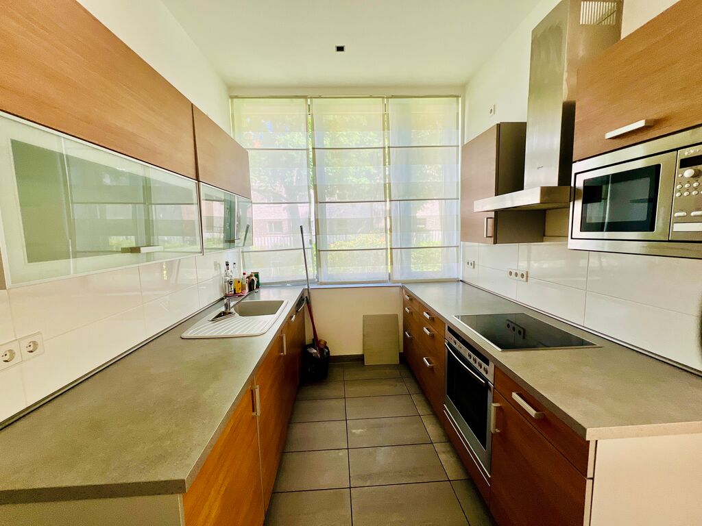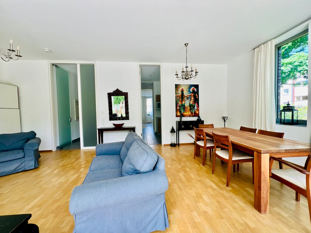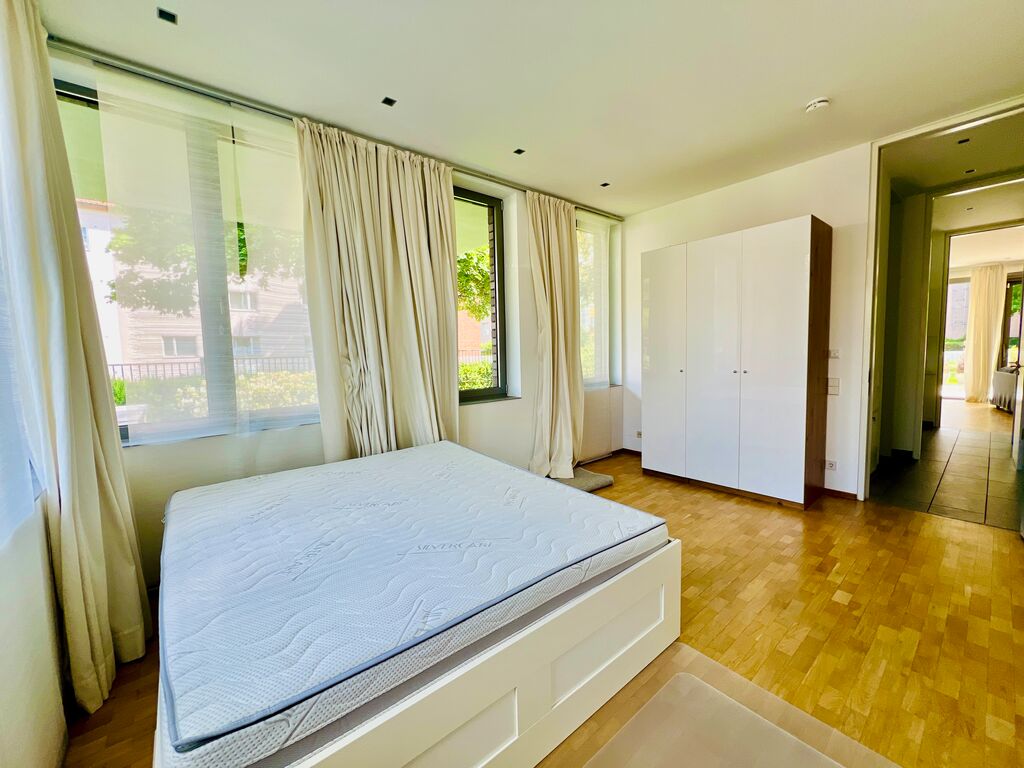 Vermietung für 12 Monate maximal. Eichenparkett mit FBH Zwei vollwertige Bäder Raumhöhe Türen Deckenhöhe 3.20 Meter EBK im abgetrennten Raum Stufenlose Terrassenausgang Komplett möbliert