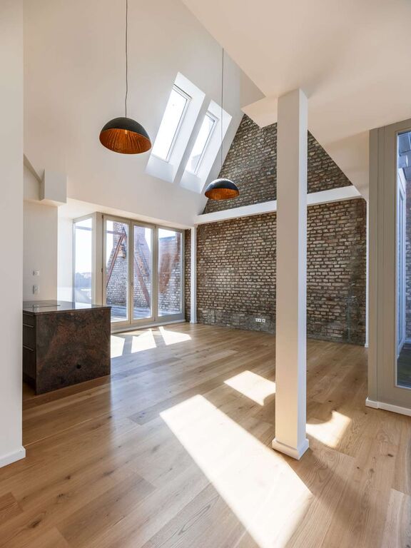 Wohnen Sie noch oder residieren Sie schon? In diesem phänomenalen Penthouse im "Joli Cœur"über den Dächern Berlins, im ehemaligen und denkmalgeschützen Klinikgebäude, werden Sie sich sofort zuhause fühlen! Es erwartet Sie ein offener Grundriss mit lichtdurchfluteten Räumen, bodentiefen Fenstern, immensen Skylights, 2 privaten Terrassen und einer außergewöhnlichen Designerküche mit Miele-Geräten und Granit-Arbeitsplatte. Die Dachgeschosswohnung bietet ausreichend Platz für Paare oder eine kleine Familie und ist, barrierefrei, durch einen Aufzug erreichbar. Sie betreten die Wohnung durch einen Eingangsbereich, der fließend in den geräumigen Essbereich übergeht. Immense, süd-westlich ausgerichtete Fensterfronten und mehrere Oberlichter erfüllen die Räume mit natürlichem Licht, dass selbst die gruseligsten Berliner Wintertage ihren Schrecken verlieren. Holzdielen und eine Backsteinwand sorgen für eine warme und heimelige Atmosphäre. Die meterhohe, spitz zulaufende Decke in der offenen Wohnküche gibt dem Raum ein modernes, loftartiges Gefühl von fantastischer Freiheit. Die elegante Küche in dezentem Grau mit glänzenden Granitarbeitsflächen beeindruckt durch ihre puristische Form und ist das beliebte Herzstück der Wohnung. Die Einbauschränke bieten eine Menge Stauraum und sind eine Maßanfertigung, die Küchengeräte sind von Miele. Nicht eine, sondern zwei extrem private Sonnenterrassen mit historischen Details laden ein zum Entspannen oder Feiern mit Freunden und Familie. An jeweils gegenüberliegenden Seiten der Wohnung finden Sie die beiden Zimmer - die Aufteilung gewährleistet Ihnen Privatsphäre, und sie sind so geräumig, das Sie jedes, ganz nach Wunsch, flexibel als Masterbedroom nutzen können. Perfekt fürs Homeoffice Ein Duschbad und ein Gäste-WC ermöglichen die Trennung von privatem und öffentlichem Bereich, ein Flur hat das Potential, mit Einbauten die Waschmaschine und Besenkammer zu beherbergen. Sie haben zudem die Möglichkeit, einen Kamin zu installieren, ein Schornstein ist schon vorhanden.