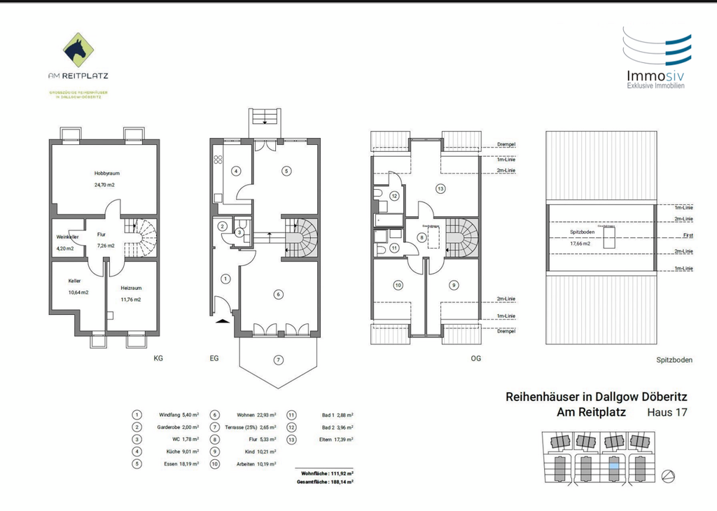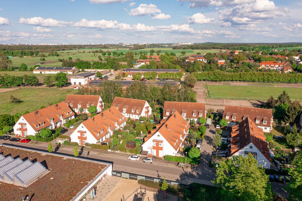 Wer aus der Großstadt raus, aber deren Vorzüge trotzdem nutzen will, findet in Dallgow-Döberitz den idealen Wohnort: direkt im Umland, nur 8 km nordwestlich von Berlin. Neben seiner idyllischen Lage umgeben von Natur, der direkten und kurzen Anbindung an Berlin und den hervorragenden Einkaufsmöglichkeiten hat der Ort ein absolutes Alleinstellungsmerkmal: Dallgow-Döberitz ist in der Reiterszene als Turnierstandort bekannt. Dort gibt es etwa 400 Pferde, 250 weitere in den beiden Nachbardörfern. Am östlichen Ortsrand, unmittelbar am Naturschutzgebiet Döberitzer Heide, liegt die Reihenhaussiedlung in einer ruhigen Gegend. Mit der Buslinie 670, nur 200 Meter entfernt, gelangt man zum Bahnhof Dallgow-Döberitz. Von dort erreicht man mit der Regionalbahn in nur 20 Minuten die Berliner City-West. Die nächstgelegene Autobahnanschlussstelle ist Berlin-Spandau an der A10 (westlicher Berliner Ring), nur wenige Fahrminuten entfernt. Jedoch geht oder fährt man aber auch gern in den Nachbarort, um im Hofladen leckere Lebensmittel und Spezialitäten frisch einzukaufen. Die Infrastruktur in Dallgow-Döberitz ist modern und umfassend: Einkaufsmöglichkeiten, Supermarkt und Discounter, Ärzte, Restaurants, alle Schultypen, Kitas, Seniorenresidenz, Bibliothek und vieles mehr – wie Spielplätze, Tanzschulen und Fitnessstudios. Der Havelpark mit seinem vielseitigen Shopping- und Gastronomieangebot auf ca. 59.200 m² ist nur 3 Autominuten entfernt. Im Gewerbepark „Döberitzer Heide“ haben sich zahlreiche Firmen, Büros und Lager aus Handel, Produktion und Dienstleistungen, darunter ein Supermarkt und eine Tankstelle, angesiedelt. Aber auch ein Erdbeer-Erlebnishof, das Olympische Dorf und eine groß angelegte Outlet-Shopping- Anlage in Form eines Dorfes ist auf kurzen Wegen zu erreichen.