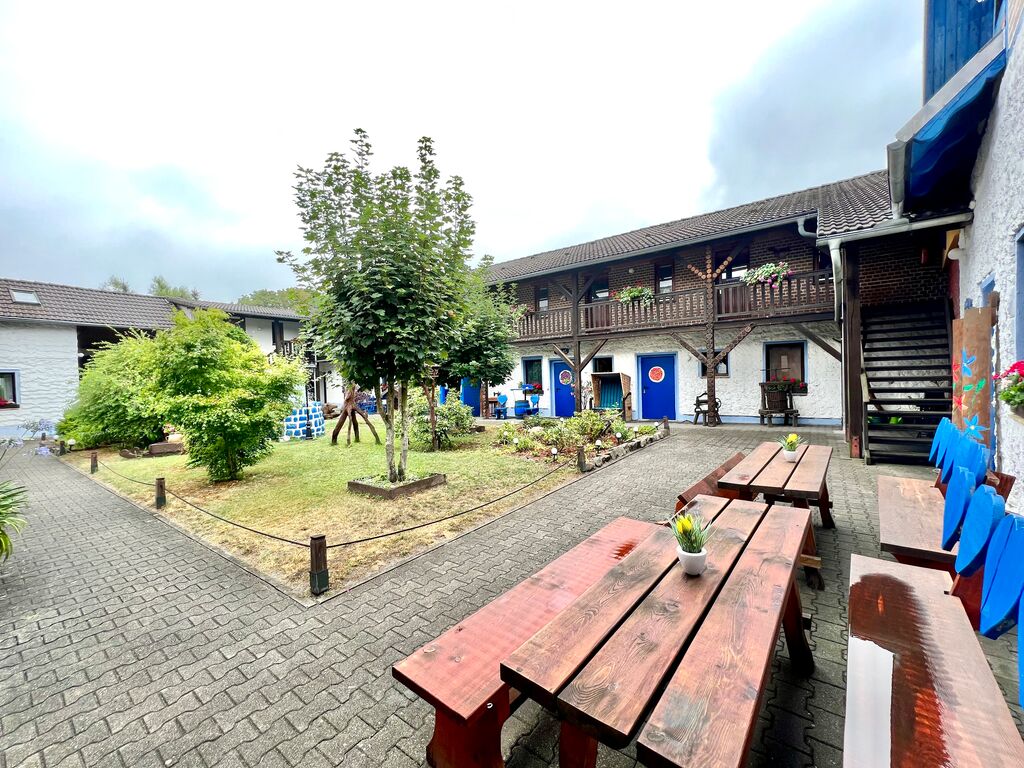 • Der hier angebotene 4 Seitenhof befindet sich in Brandenburg und wartet auf Ihr Projekt! Das Haus und die Umgebung bietet sich für verschiedenste Projekte an. Im Moment wird es als Ferienhof von Personen mit Körperbehinderung/ Handicap gebucht sowie für Geburtstage, Hochzeiten und andere Feierlichkeiten. Denkbar sind Wohnprojekte für jung & alt, ebenfalls für körperlich eingeschränkte Personen, Mutter-Kind-Angebote, Kinderheime, Jugendbetreuung, Generationen übergreifendes Wohnen, Wohnheim mit diverser Ausrichtung, aber auch ein Reiterhof wäre vorstellbar - die große Koppel bietet sich dazu idealerweise an, als auch der Hof selbst. Die schöne und gepflegte Anlage, das riesige zugehörige Feld und der 4-Seitenhof selbst bieten so viel Potential - worauf warten? Es gibt 20 freundlich eingerichtete Zimmer (mit schönen Bauernmöbeln) und jeweils einem Badezimmer, welche insgesamt 63 Personen einen Schlafplatz bieten - Gästefeiern sind für bis zu 160 Personen möglich. Der Hof bietet alles für einen gemütlichen Aufenthalt wie Speiseraum, Partyraum, Zubereitungsküche/ Buffetraum, Aufenthaltsraum, einen schönern Innenhof, einen Gartenbereich mit Tischen & Bänken, einen Grillplatz, Tümpel, Minigolf,... sowie einer großen Koppel, direkt am Grundstück. Es ist wie folgt aufgegliedert: